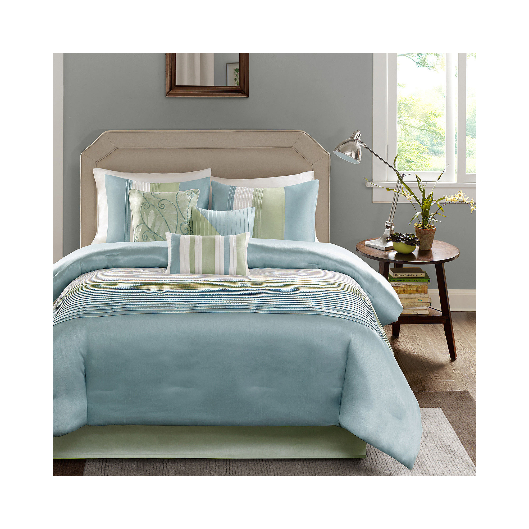 green and blue tones brushed fabric on the back 7-piece set includes: comforter 2 shams bedskirt with 15\